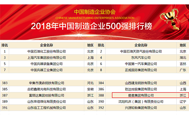 近日,2018年中國制造企業(yè)500強(qiáng)暨中國裝備制造業(yè)100強(qiáng)排行榜發(fā)布,星星集團(tuán)名列第388位,較去年的404位進(jìn)步了16位。