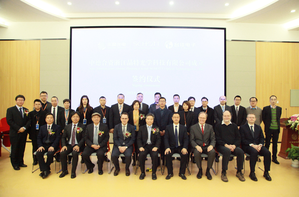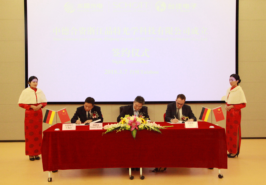 3月7日下午,中德合資浙江晶特光學(xué)科技有限公司成立儀式在水晶光電綜合樓博學(xué)廳舉行。椒江區(qū)政府副區(qū)長(zhǎng)盧建波、區(qū)府辦、區(qū)發(fā)改局、區(qū)經(jīng)信局、集聚區(qū)椒江分區(qū)管委會(huì)、區(qū)商務(wù)局、洪家街道等單位負(fù)責(zé)人、肖特集團(tuán)先進(jìn)光學(xué)事業(yè)部執(zhí)行副總裁法爾克先生及其團(tuán)隊(duì)、水晶光電董事長(zhǎng)林敏、總經(jīng)理范崇國(guó)、水晶中高層團(tuán)隊(duì)及臺(tái)佳電子團(tuán)隊(duì)、晶特光學(xué)籌建團(tuán)隊(duì)共同出席儀式。